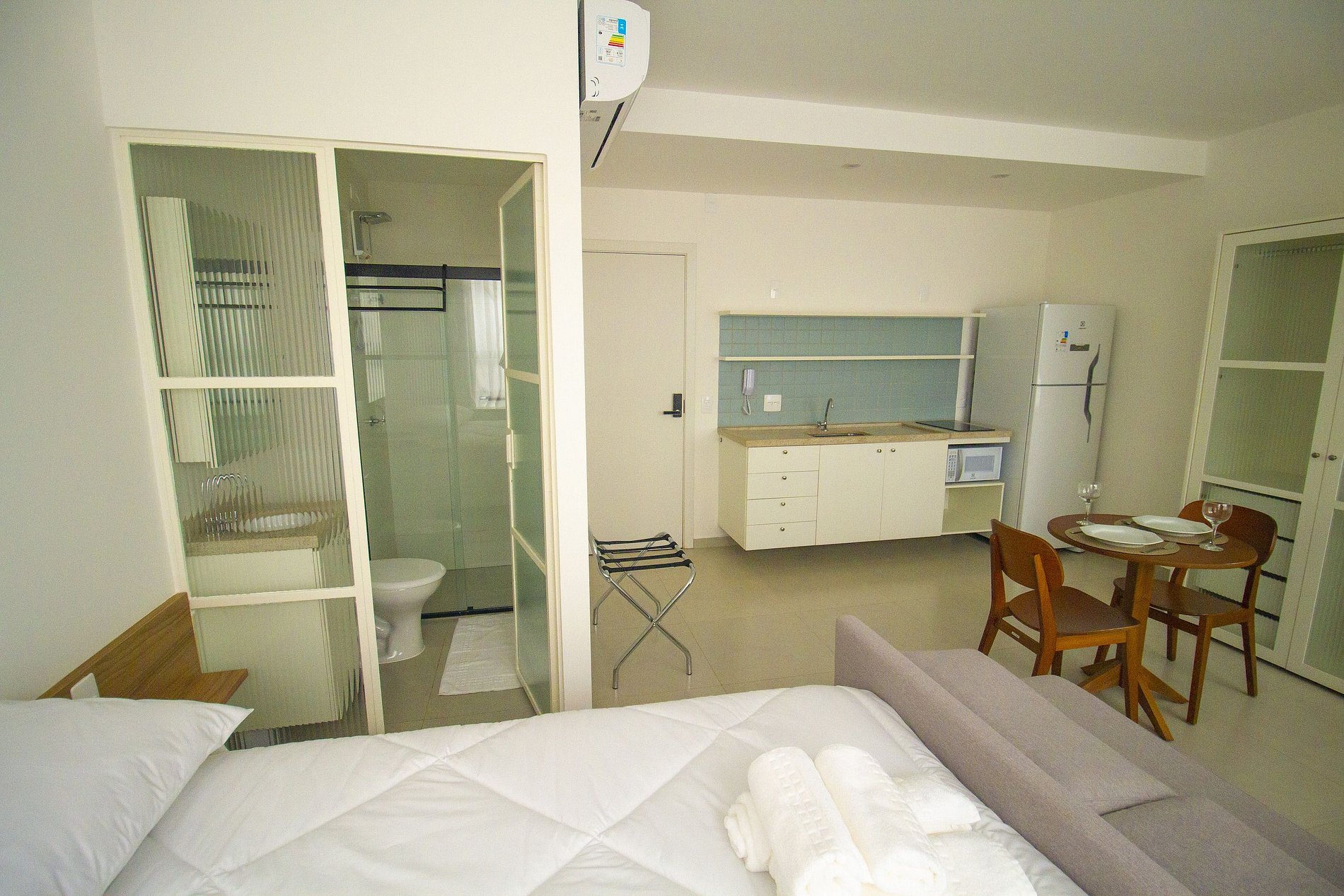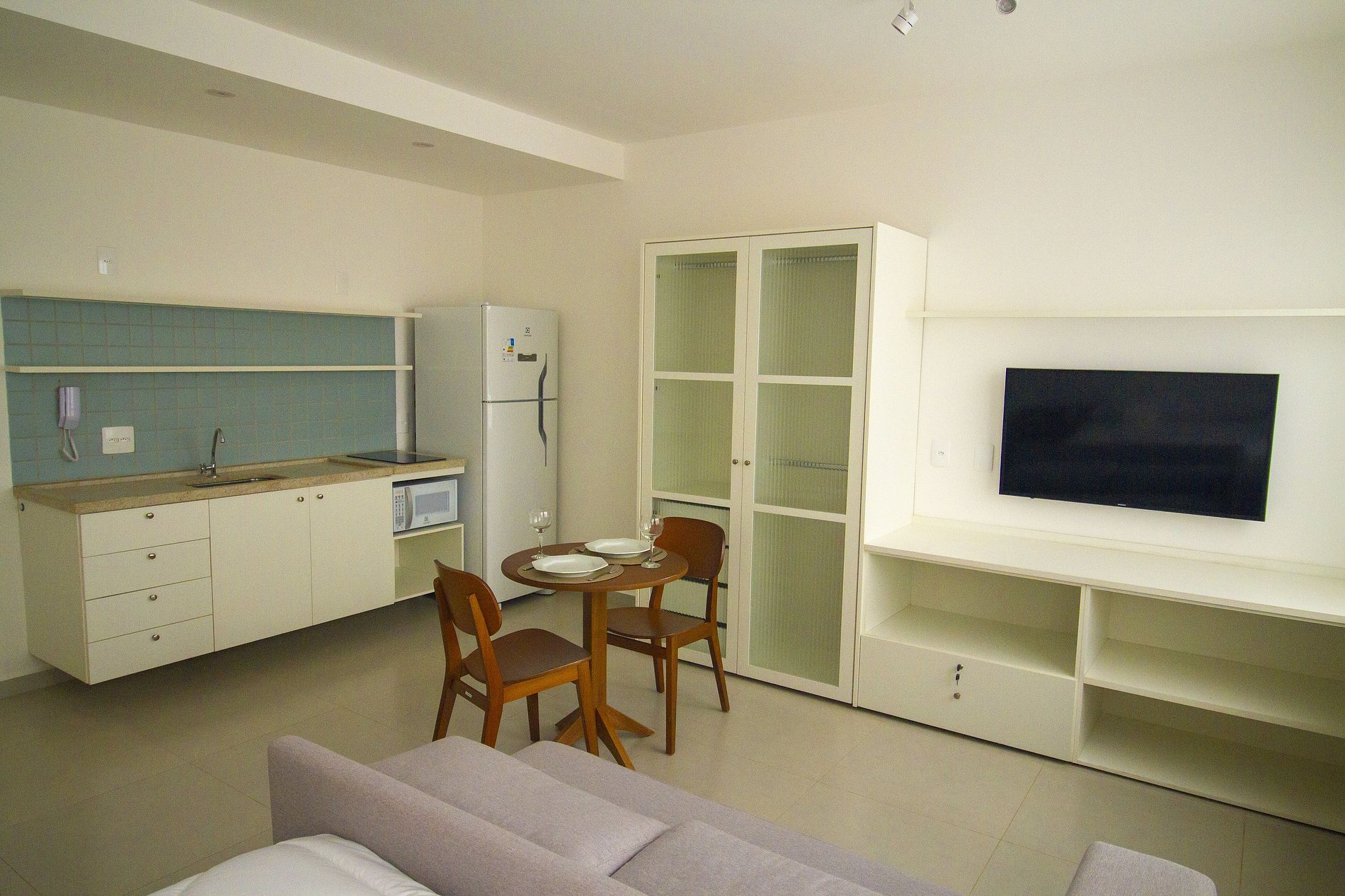 - Cozinha equipada com fogão de indução, micro-ondas, geladeira, pratos, talheres, copos