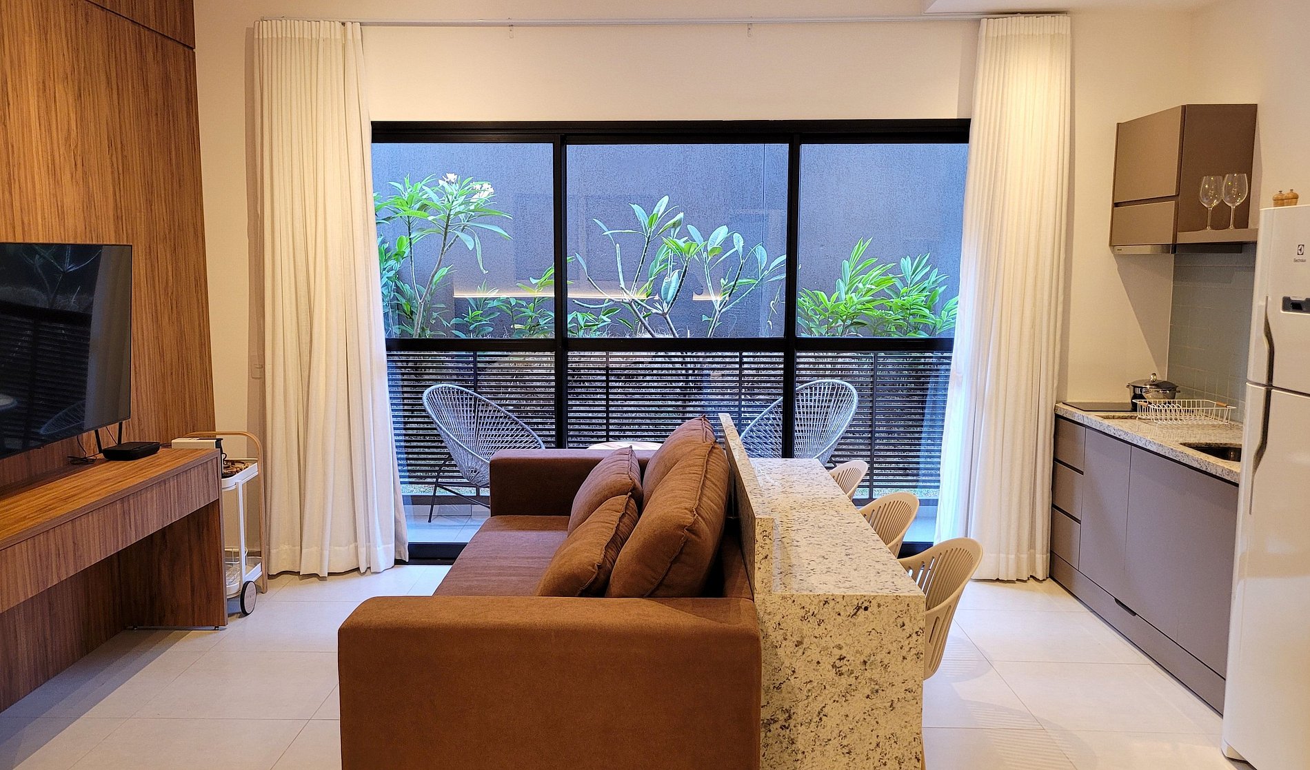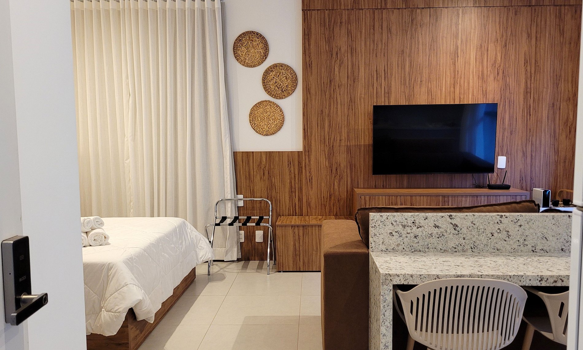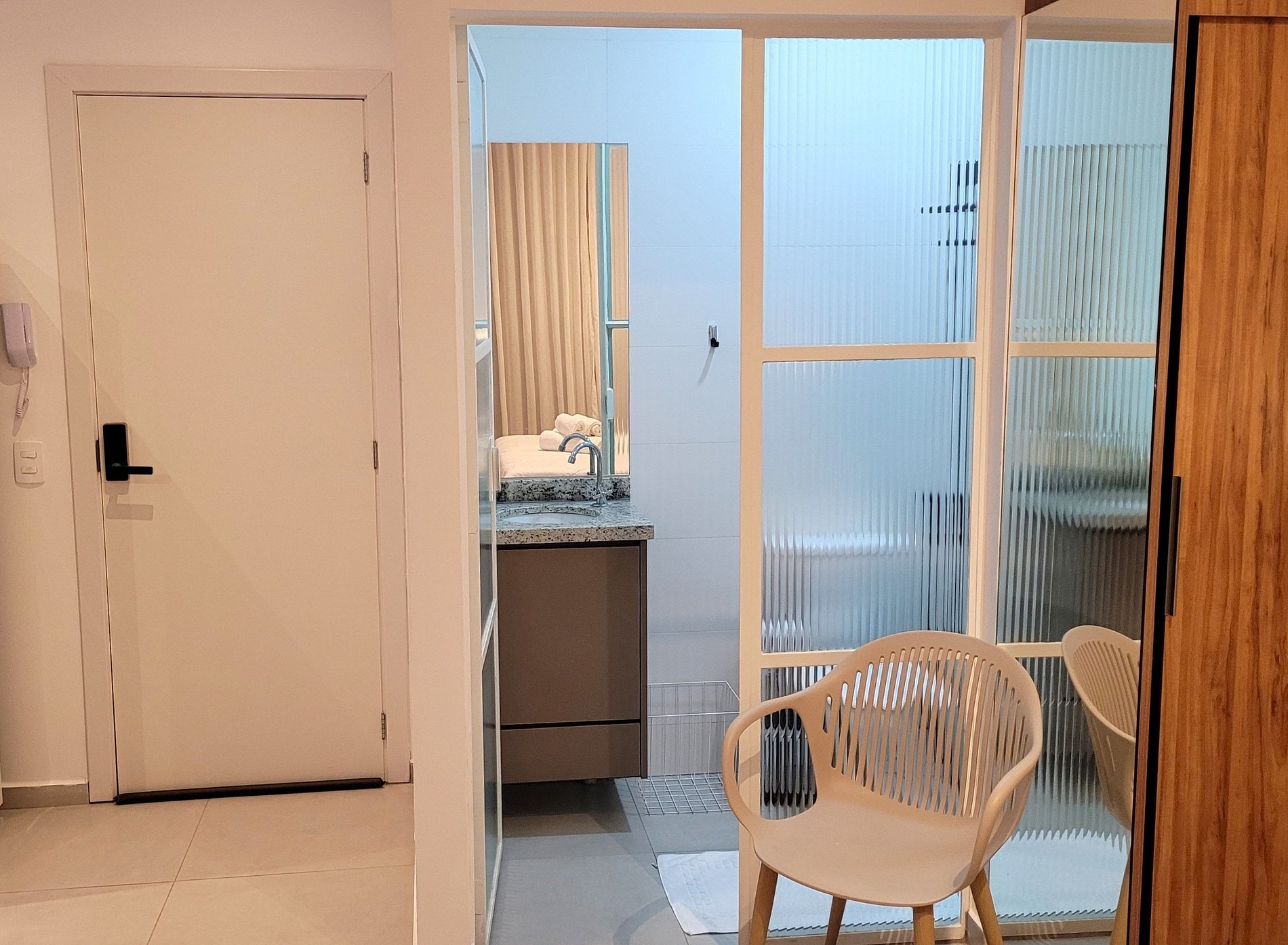 O check-in virtual precisa ser feito antecipadamente para acesso ao prédio e ao apartamento. ACESSO AO PRÉDIO: Reconhecimento Facial. ACESSO AO STUDIO: Senha